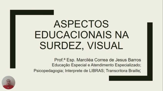 Olá a todos! Sou a professora Marciléia, especialista em educação especial e atendimento especializado, intérprete de libras. Hoje vamos conversar sobre os aspectos educacionais da surdez e deficiência visual.