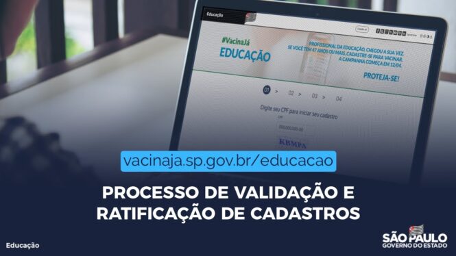 No site vacinaja.educacao.sp.gov.br, os professores e demais profissionais da educação realizam o cadastro para receberem a vacina contra a Covid-19. Para garantir a veracidade das informações, é necessário passar por um processo de validação, no qual os dados fornecidos são verificados e confirmados antes da marcação da vacinação.
