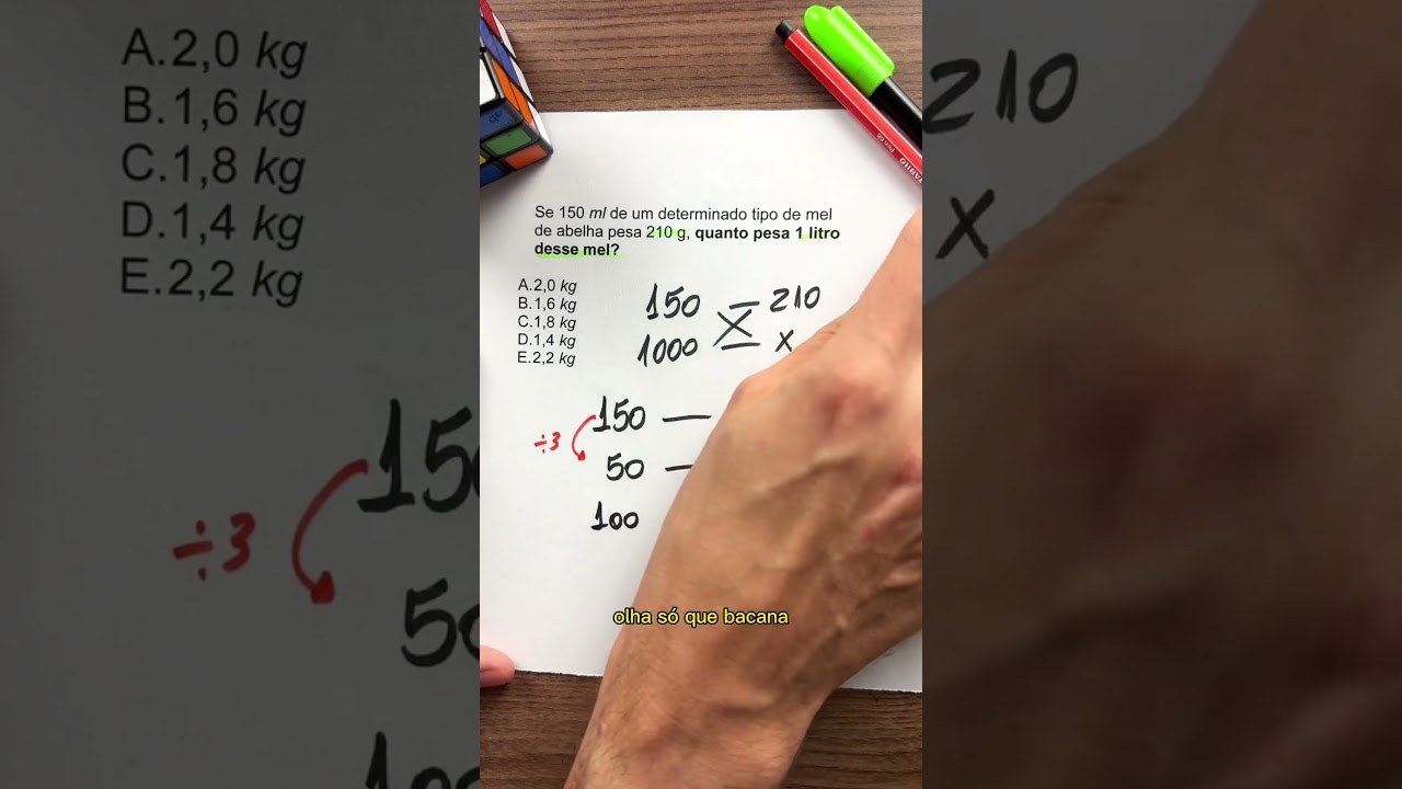A partir dessa relação, podemos dividir 150 por 3 e 210 por 3, o que resulta em 50 ml equivalente a 70 g. Em seguida, multiplicamos 100 por 2 e 70 por 2, chegando ao peso de 100 ml de Mel, que corresponde a 140 g.
